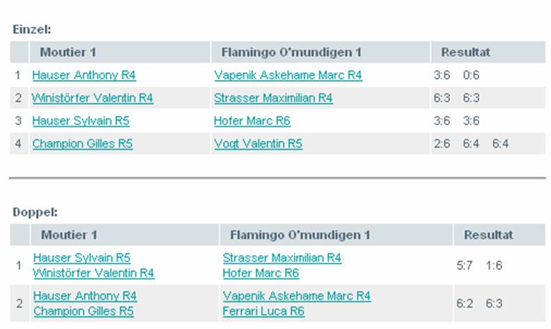 Am Samstag, 22. September, war es soweit. Letzte Runde im Jura gegen die Mannschaft aus Moutier. 2 Einzel konnten wir gewinnen und 2 Matches gingen verloren, davon eines in drei Sätzen. Somit waren beide Mannschaften Punktgleich, wir jedoch mit einem Satzgewinn mehr. Die Doppel mussten oder konnten alles entscheiden. In zwei spannenden Matches (mit einem miteiferndem Andy Strasser als Coach) gelang es uns ein Match ohne Satzverlust zu gewinnen, was uns den Sieg brachte. |